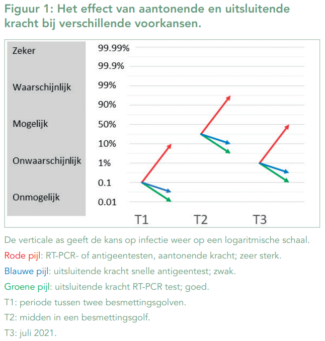 Bij een zeer lage voorkans van 0,07% (T1) kunnen zowel een negatieve snelle antigeentest als een negatieve RT-PCR heel veilig COVID-19 als hypothese uitsluiten. Bij een hoge voorkans van 20% (T2) brengt een negatieve snelle antigeentest, die slechts een zwakke uitsluitende kracht heeft, de nakans op 10% en een negatieve RT-PCR test, die een goede uitsluiter is, de nakans op 3%. In die gevallen hebben 1 op respectievelijk 10 of 33 negatieve geteste personen toch een infectie.